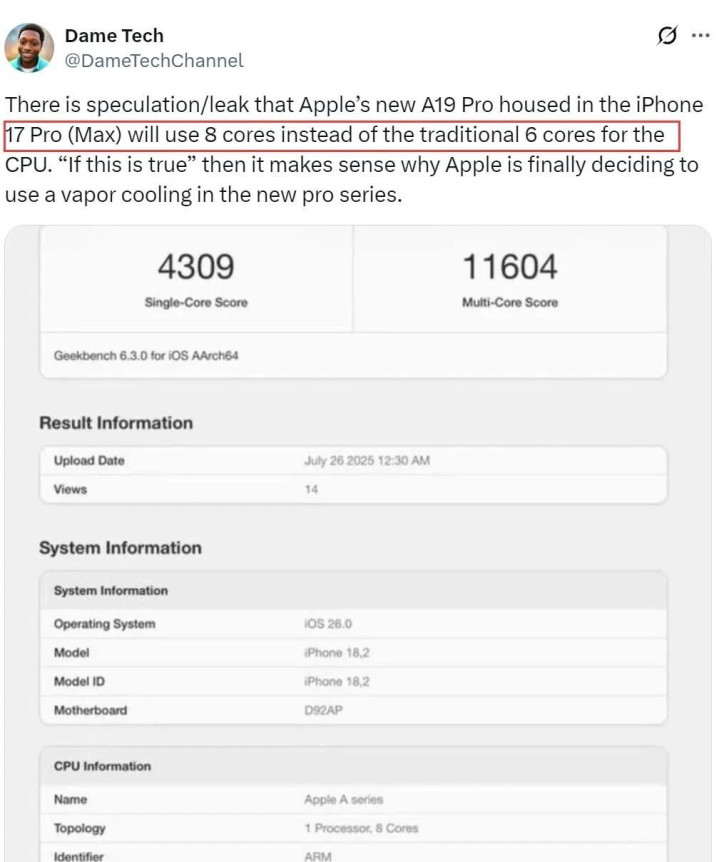 于是,推测来了——是不是A19 Pro终于不再是传统的6核,而是改成了8核?