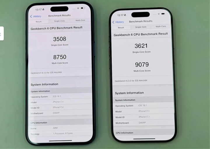 对比一下现役iPhone 16 Pro的A18 Pro:单核3621分,多核9079分。差距肉眼可见,尤其是多核直接多了2500多分,这幅度让人怀疑苹果是不是偷偷换了引擎。