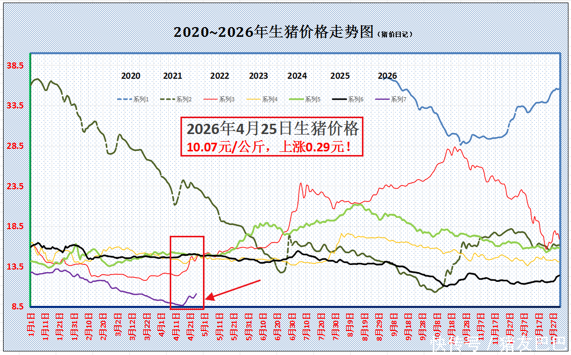 从最新数据分析,截至4月25日,全国外三元瘦肉型标猪价格出栏均价在10.07元/公斤,相比昨日上涨0.29元,相比4月中旬低值猪价上涨1.44元,阶段性猪价大涨16.7%,生猪均价重返“5元时代”!