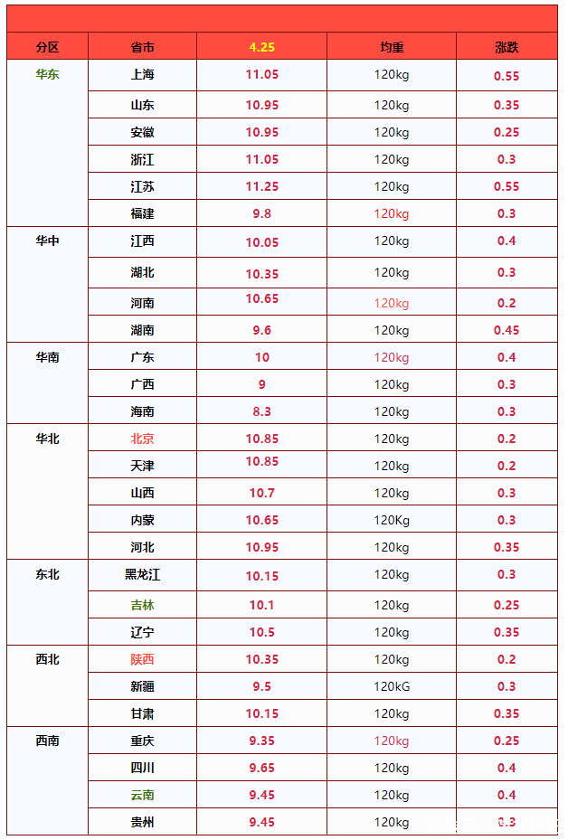 其中,在传统低价地区,目前,黑吉辽报价涨至10.1~10.5元/公斤,山西以及河北报价在10.7~10.95元/公斤,陕甘地区报价在10.15~10.35元/公斤!北方地区,猪价普遍涨入“5元时代”,南北倒挂现象增多,尤其是,在南方市场,西南地区,川渝报价在9.35~9.65元/公斤,两广报价在9~10元/公斤!在华东地区,江浙报价在11.05~11.25元/公斤,河南报价在10.65元/公斤……